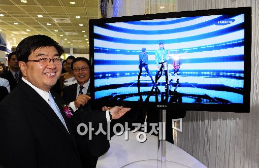월드 IT 쇼 2009가 17일 오전 서울 삼성동 코엑스에서 열렸다. 이날 삼성전자 부스를 찾은 임채민 지식경제부 제1차관이 신제품 초슬림 디자인 LED TV 둘러보고 있다.