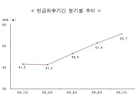 기업들의 현금회수기간은 지난해 2분기 이후 계속 증가하고 있는 것으로 집계됐다. 올해 1분기 현금회수기간은 55.7일였고 지난해 4분기에는 51.4일, 3분기에는 46.5일, 2분기에는 41.3일였다.
