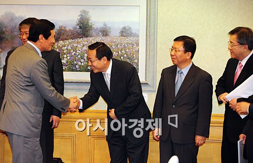 윤증현 기획재정부 장관이 18일 서울 명동 은행회관에서 시중 연구소장을 만나고 있다.