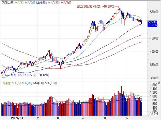 일봉상 5일 이동평균선은 지난달 말경 20일 이동평균선을 뚫고 내려온 이후 하락세를 이어가고 있다. 이제는 60일 이동평균선과의 간극도 얼마 남지 않았다.