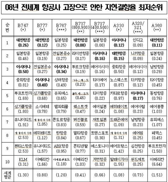 2008년 우리 국적 항공사가 고장으로 인한 지연·결항률이 세계 최저 수준인 것으로 나타났다.