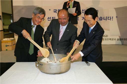정종환 국토해양부 장관(가운데)과 최재덕 대한주택공사 사장(왼쪽), 이종상 한국토지공사 사장이 양 공사의 화합을 비는 차원에서 콩과 팥을 넣은 밥을 섞는 퍼포먼스를 하고있다.