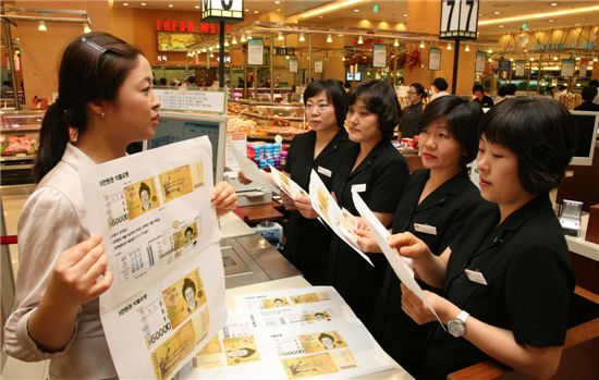 한편, 백화점 및 마트는 판매사원을 대상으로 '5만원권 지폐 유통에 따른 위변조 식별요령' '5만원권 구별법' 등 교육을 실시한 상태다. 5만원권 사용으로 환전자금이 많아질 것으로 예상되고 1만원권에 비해 화폐 가치가 5배나 높아 위폐가 유통될 수 있기 때문이다.