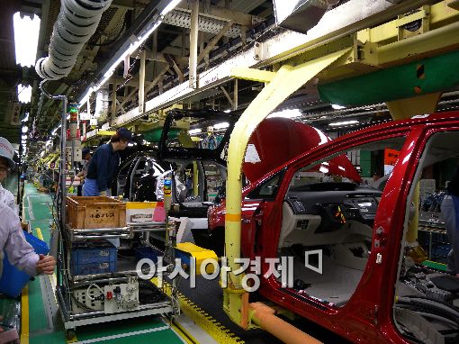 지난달 일본에서만 1만6000대 가량이 판매될 정도로 공전의 히트를 기록한 프리우스인만큼 생산라인의 대부분을 프리우스가 차지하고 있었다. 1~2 공장에 프리우스를 혼류 투입해 생산량을 극대화했다. 근무 강도가 상당했다. 오전 근무조는 점심시간 이전에 5분, 10분 두 차례 휴식이 전부. 오후에는 10분씩 두 차례 쉰다. 쉬지 않을때는 콘베이어벨트를 통해 쉼없이 밀려오는 자동차에 나사를 조이고 부품을 탑재한다. 하나같이 이마에 구슬땀을 송글송글 달고 업무에 임하고 있었다.
