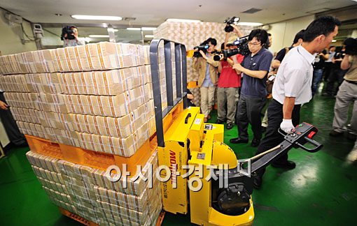 5만원권이 시중에 유통되는 첫날인 23일 오전 서울 중구 한국은행 본관에서 관계자들이 5만원권을 옮기고 있다.