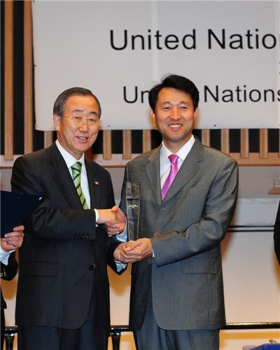 뉴욕을 방문중인 오세훈 서울시장이 23일(현지시각) UN본부에서 반기문 UN사무총장으로 부터 '2009 유엔 공공행정상' 트로피를 받고있다. 2003년 제정된 유엔공공행정상은 유엔공공행정네트워크(UNPAN) 가 전세계 공공기관을 대상으로 우수정책사례를 뽑아 수여하는 상으로 서울시는 아리수 수질 실시간 공개 서비스와 시민 아이디어 모집창구인 천만상상 오아시스 등 2개 부분에서 대상과 우수상을 각각 차지했다. (서울시제공)