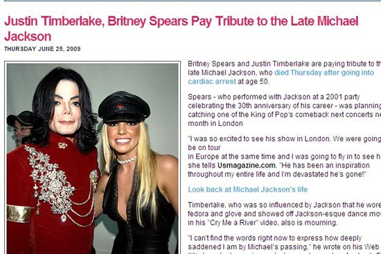 미국의 연예주간지 'US위클리'에 따르면 스피어스와 팀버레이크는 누구보다 먼저 잭슨을 추모했다.