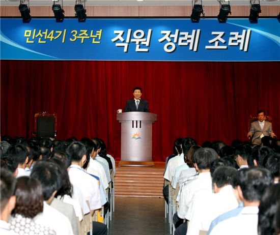 금천구(구청장 한인수)는 29일 오전 8시30분부터 구청 12층 대강당에서 1000여 공직자들이 참석한 가운데 민선4기 3주년 직원정례조례를 가졌다.