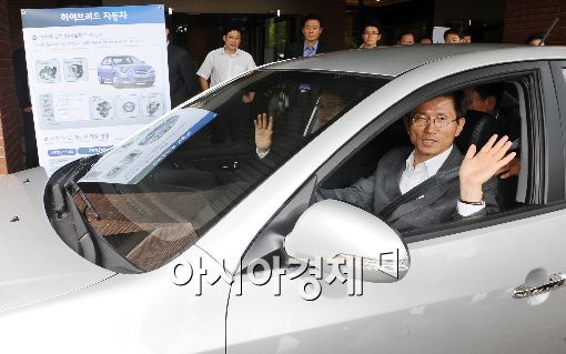 29일 오후 과천시청에서 열린 '녹색교통 시범도시 조성을 위한 MOU 체결식'을 마친 김문수 경기도지사와 이병욱 환경부 차관 등 참석자들이 세계최초 LPG아반떼 하이브리드 차량을 시승하고 있다. 친환경 녹색교통 시대를 이끌어갈 현대 아반테 LPG하이브리드 승용차는 내달 8일 출시된다.