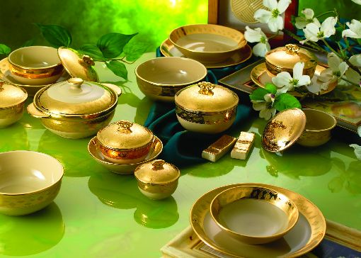 반상기 '행복'은 은은한 메탈바탕을 기본으로 사용해 당초문양을 주제로 수를 놓은듯 디자인했다. 골드로 중앙과 각 모서리에 포인트를 두어 고급스러움을 강조한 디자인 제품이다.