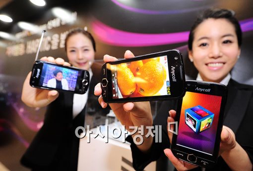 박재순(왼쪽부터) 삼성전자 무선사업부 한국 총괄 전무, 신종균 부사장, 휴대폰 모델로 활동중인 손담비가 '햅틱 아몰레드'를 선보이고 있다.