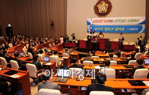30일 오후 국회 제2회의장에서 한나라당 의원들이 긴급 의원총회를 갖고 있다.