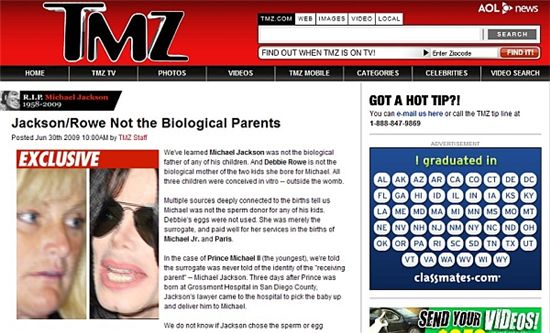 TMZ닷컴은 측근들의 말을 인용해 마이클 잭슨이 세 아이의 친아버지가 아니며 첫째 프린스 마이클 주니어와 둘째 패리스 마이클 캐서린 잭슨을 낳은 것으로 알려진 잭슨의 두 번째 부인 데비 로우 역시 친어머니가 아닌 대리모라고 주장했다.