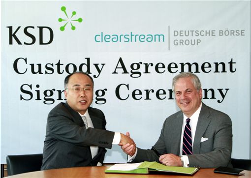 한국예탁결제원(사장 이수화)은 1일 룩셈부르크 국제예탁결제기구(ICSD)인 클리어스트림(대표 제프리 테슬러)과 지난달 30일 국내 외국인 투자 지원을 위한 업무 계약을 체결했다고 밝혔다.