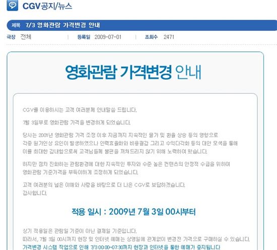 이들은 공지에서 "당사는 2001년 영화관람 가격 조정 이후 지금까지 지속적인 물가 및 환율상승 등의 영향으로 각종 원가인상 요인이 발생했으나 인력효율화와 비용 절감 그리고 수익다각화 등의 대안 모색을 통해 이를 최대한 감내함으로써 고객에게 불편을 끼쳐드리지 않기 위해 노력했다"고 전했다.