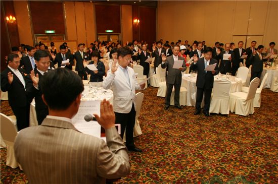 1일 오후 역삼동 르네상스호텔에서 열린 강남구상공회 출산장려 결의대회에서 맹정주 강남구청장과 기업대표들이 결의를 다지고 있다.