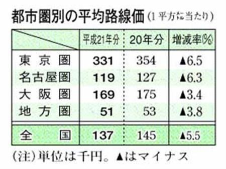 한편 일본에서 노선가가 가장 높은 지점인 도쿄도 주오(中央)구의 긴자주오도리(銀座中央通)의 노선가는 3120만엔으로 10년 만에 하락했지만 2% 내리는데 그치는 등 원래 노선가가 높았던 상업지구의 낙폭은 비교적 적었다는 지적이다.