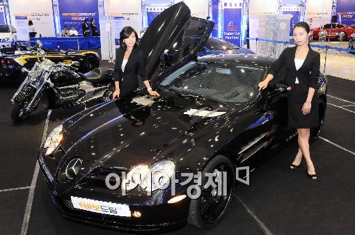 국내 최대 자동차 애프터마켓 및 튜닝 전시회인 '2009 서울오토살롱'이 2일 오전 서울 삼성동 코엑스에서 개막한 가운데 벤츠 'SLK55AMG' 앞에서 모델들이 포즈를 취하고 있다. 이번 서울오토살롱에서는 세계적 명차 및 슈퍼카와 이색 튜닝카 전시를 비롯, 자동차 관련 150여개 업체가 전시에 참가하는 등 역대 최대 규모이다.