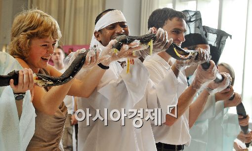 3일 서울 종로구 명륜동 성균관대 600주년기념관에서 국제서머스쿨에 참가한 외국인 대학생들과 한국인 대학생들이 조선시대 전통의상을 착용하고 ‘500명분 둥근 김밥’을 만들고 있다. 둥근 김밥은 세계 평화와 세계는 하나를 상징한다.