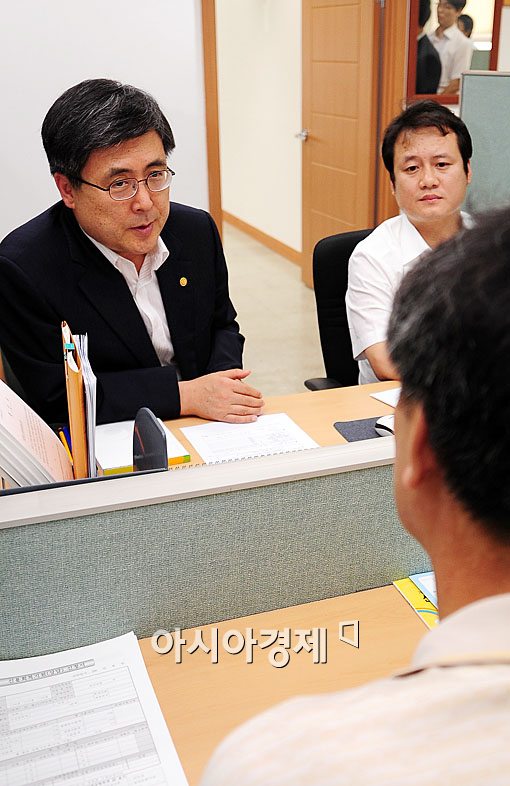 금융소외자의 현장의 목소리를 듣기 위해 2일 오후 서울 신용회복위원회 영등포지부를 방문한 진동수(왼쪽) 금융위원장이 민원인으로부터 애로 사항으로 듣고 있다.