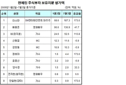 이밖에 주식부자 연예인 순위는 ▲3위 정지훈씨(가수 비) 52억6000만원 ▲4위 신동엽씨 11억6000만원 ▲5위 강호동씨 10억3000만원이며 권보아(가수 보아), 윤종신, 양수경씨도 2억~4억원 규모의 주식을 보유한 것으로 밝혀졌다.