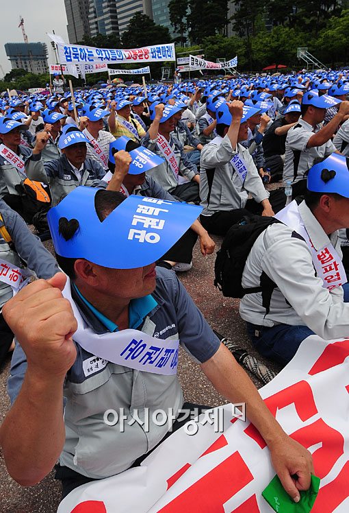 7일 서울 여의도 공원에서 열린 '쌍용차 노조 공장 불법점거 파업 규탄 대회'에 참석한 쌍용차 종사들이 '당장 공권력을 투입하라'며 구호를 외치고 있다.