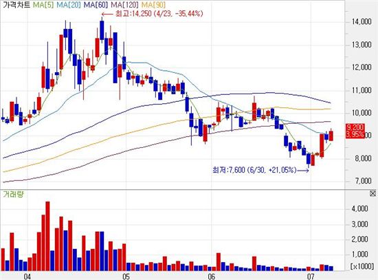 7일 오후 2시10분 현재 산성피앤씨는 전일 대비 380원(4.29%) 오른 9230원에 거래되고 있다.