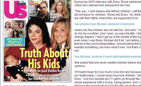 미국의 연예주간지 US위클리 인터넷판은 9일(한국시간)'특종(Exclusive)'이라는 부제로 "잭슨의 두 아이 프린스 마이클 1세와 패리스 캐서린 잭슨의 어머니이기도 한 로는 아이 낳기를 원하지 않았었다"고 보도했다.