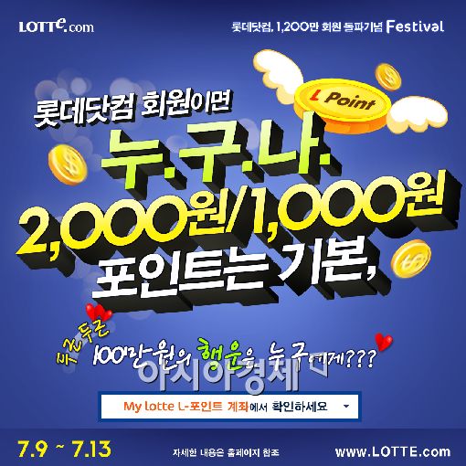 이는 회원 수 1200만 명 돌파기념으로 지난 9일 시작한 '200억 포인트를 쏩니다' 이벤트의 일환이다. 롯데닷컴은 1200만 회원 전원에게 1000원~2000원의 포인트를 일괄 지급한 한편 창사 이래 가장 많은 상품을 구입한 고객 1명과 가장 자주 구입한 고객 1명에게 특별히 100만원의 L-포인트를 지급했다. L-포인트는 롯데닷컴 안에서 현금과 동일하게 활용되는 사이버머니다.