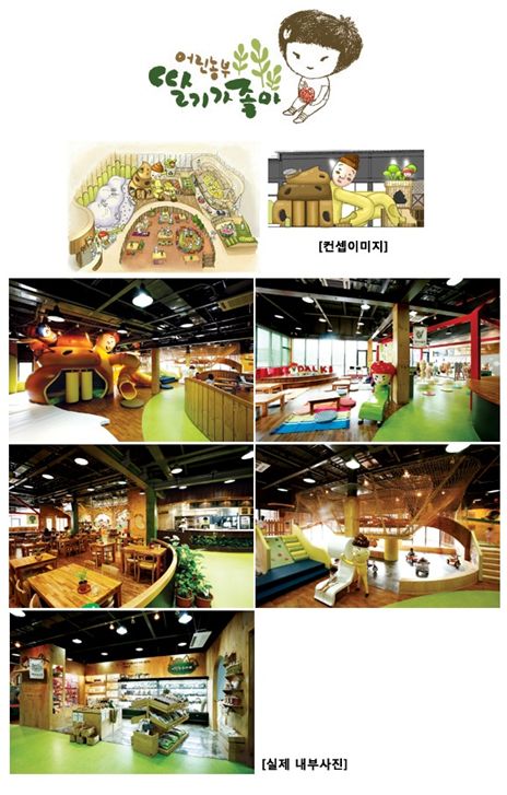 지난 8일 서울 잠실 올림픽공원 내 평화의 광장에서 오픈한 '딸기가좋아' 캐릭터 테마파크는 유명 캐릭터 '딸기'를 주제로해서 꾸며진 유기농 테마파크이다. 파주 헤이리에 꾸며진 '딸기가좋아' 2호격인 이 곳은 실내 까페형식으로 꾸며져 장마철이라도 가족 주말 나들이 코스로 좋다.