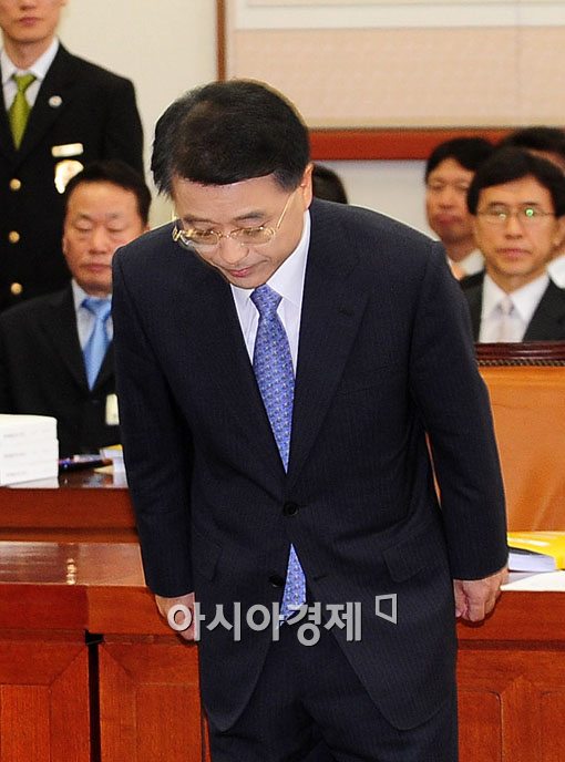 천성관 검찰총장 후보자에 대한 인사청문회가 13일 오전 국회에서 열렸다. 증인선서를 마친 천성관 후보자가 인사를 하고 있다.