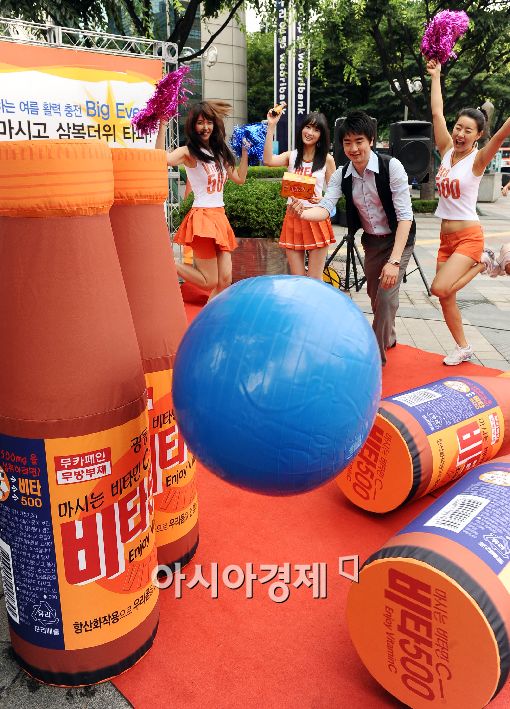 광동제약이 13일 오전 서울 종로구 세종로 광화문빌딩 앞에서 인근 직장인 및 시민들을 대상으로 초복맞이 더위타파 대형 볼링 이벤트를 진행하고 있다.