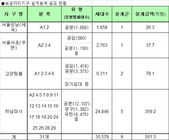 주공은 하남미사와 강남세곡, 서초우면, 고양원흥 등을 모두 9곳으로 세분, 현상설계를 공모했다.