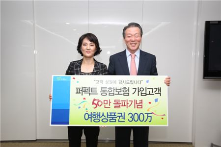 삼성생명은 13일 생명보험업계 최초로 출시한 '퍼펙트통합보장보험'의 50만번째 가입 고객인 유정임 씨를 태평로 본사로 초청해 기념식을 개최했다고 밝혔다.