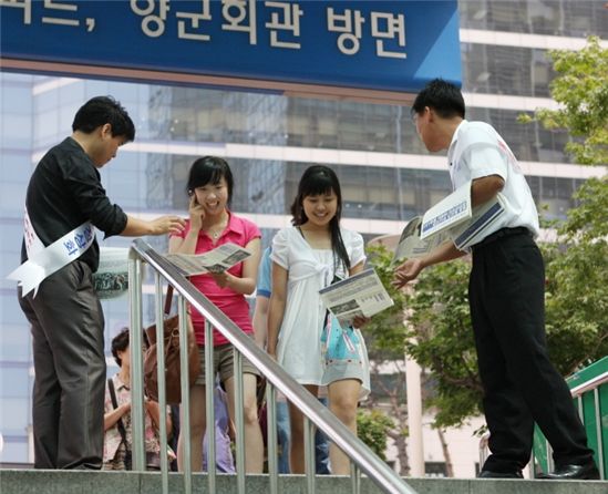 쌍용자동차 임직원들이 54일째 지속되고 있는 노조의 생산공장 불법파업 부당성을 알리기 위해 14일 길거리로 나섰다. 쌍용차 관계자들이 서울 송파구 향군회관 인근에서 불법파업 부당성과 공장 조기정상화에 국민적 지지를 당부하는 호소문을 배포하고 있다.
