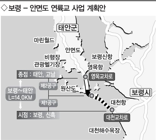 보령∼태안 도로건설공사는 보령시 신흑동에서 태안군 고남면까지 14.0km의 바다를 해저터널과 다리 등으로 잇는 대규모 국책사업이다. 사업비는 5400억원 규모다.