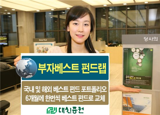 대신증권은 시중에 판매되고 있는 9700여개의 펀드중에서 가장 탁월한 운용성과를 보이고 있는 '1등 펀드'만을 골라서 고객의 성향에 따라 최적의 펀드 포트폴리오로 업데이트 해주는 '대신 부자베스트 펀드랩'을 추천했다. 금융지식이 부족한 개인들은 시장상황에 맞게 펀드 포트폴리오를 스스로 구성하기 쉽지 않은데 '대신 부자베스트 펀드랩' 상품에 가입하면 자동으로 6월마다 편입하는 펀드를 재조정해 시장상황에 맞는 베스트 펀드만을 골라 투자할 수 있기 때문이다.