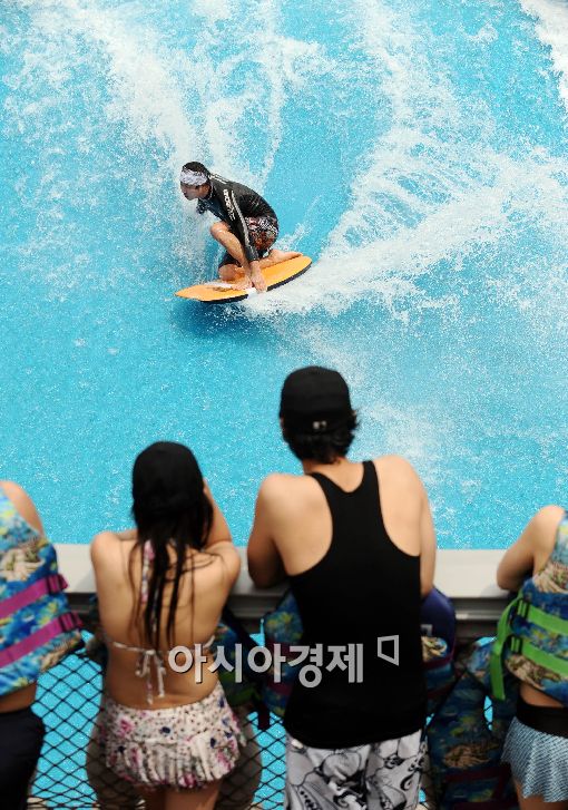 장마가 소강상태에 들면서 후텁지근한 날씨를 보인 15일 오후 경기도 용인 에버랜드 캐리비안베이를 찾은 피서객들이 서핑을 즐기며 더위를 잊고 있다.
