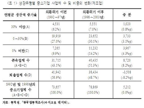 보고서에 따르면, 생산액의 연평균 증가율이 0% 미만, 즉 생산이 감소한 부실 중소기업이 외환위기 이전엔 7265개사였으나 외환위기 이후엔 1만1232개사로 대폭 늘어났고, 그 비중도 9.9%에서 14.2%로 4.3%포인트나 증가했다.