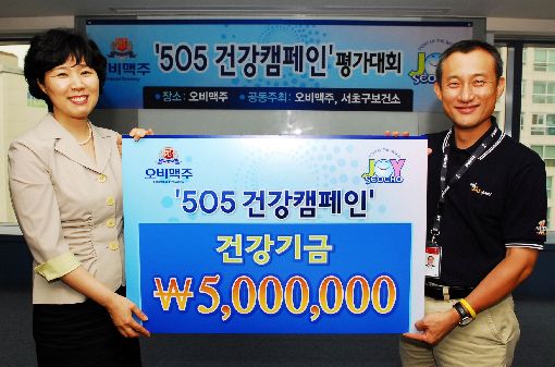 오비맥주(대표 이호림)는 서울 서초동 본사에서 사내 건전 음주문화 조성과 직원 건강증진을 위해 지난 3개월간 진행해 온 ‘505 건강 캠페인’을 마무리하는 평가대회를 갖고, 건강기금 500만원을 서초구에 전달했다.
