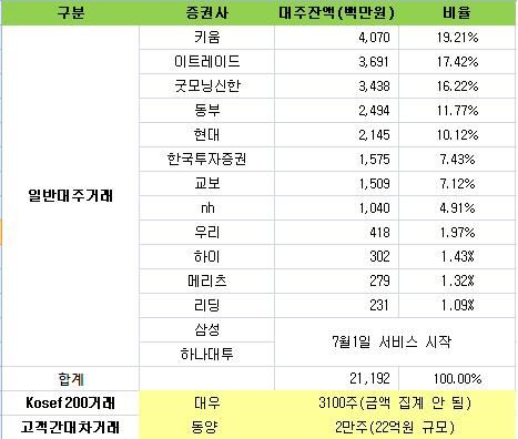 한편 금융당국은 지난 6월부터 주식시장 공매도 금지조치를 전격 해제하면서 작년 10월부터 중단됐던 개인 대주ㆍ대차거래를 재개했다. '개인 공매도'라고 불리기도 하는 개인 대주ㆍ대차거래는 크게 대주거래와 대차거래로 나눠진다. 대주거래란 증권사가 한국증권금융을 통해 주식을 빌려 고객들에게 빌려 주는 것을 의미하며 대차거래란 고객이 가지고 있는 주식을 다른 고객에게 수수료를 받고 빌려주는 형식을 말한다. 현재 대부분 증권사가 대주거래를 시행하고 있으며 대우증권은 코세프(Kosef)200을 빌려주는 방식, 동양종금증권은 고객간 대차거래를 지원하는 방식을 취하고 있다.