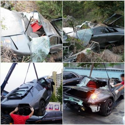 이 비운의 람보르기니 LP640(Lamborghini Murcilago LP640)는 지난달 12일 경북 김천에서 구미로 향하던 중 NF쏘나타가 탁송차를 받으면서 낭떠러지로 굴러떨어진 것으로 알려졌다.