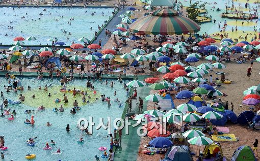 비가 그치면서 무더운 날씨를 보인 19일 오후 서울 한강 망원지구 야외수영장을 찾은 많은 시민들이 물놀이를 즐기고 있다.