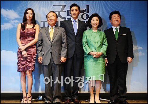 [아시아경제신문 박성기 기자] 20일 오후 12시 경기도 파주시 아트서비스 세트장에서 진행된 영화 '굿모닝 프레지던트' (감독 장진 제작 소란플레이먼트) 기자간담회에서 배우 한채영, 이순재, 장동건, 고두심, 임하룡이 포즈를 취하고 있다.