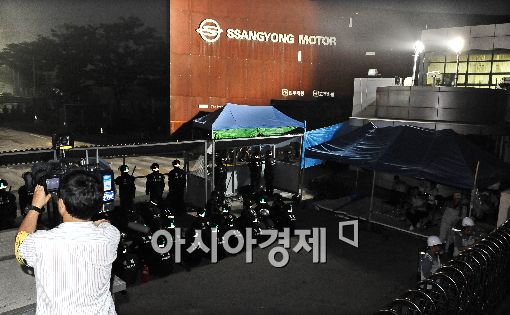 경찰과 법원이 점거파업 중인 쌍용차 평택공장에 대한 강제집행에 착수, 대치중인 가운데 20일 저녁 경기도 평택 쌍용차 평택공장에서 취재진이 상황을 주시하고 있다.