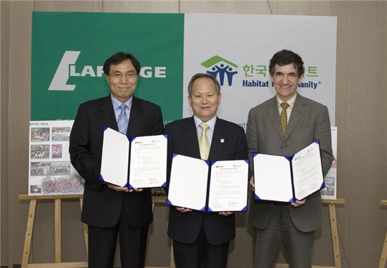 $pos="C";$title="";$txt="(왼쪽부터) 이길주 한국라파즈석고보드 부사장, 이창식 한국해비타트 회장, 미셀 푸셔코스 라파즈한라시멘트 사장