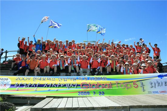 $pos="C";$title="";$txt="현대모비스의 하계수련회에 참여한 국내외 법인 신입사원들이 한라산 등반 과정에서 단체포즈를 취하고 있다.