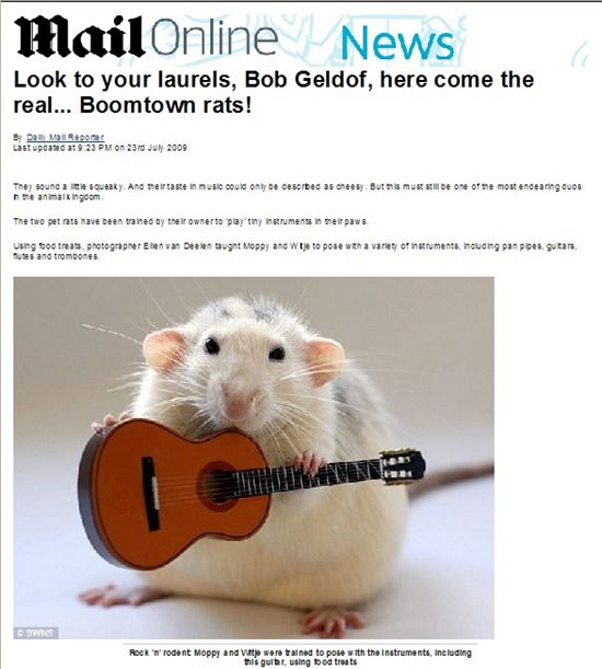 기타 치는 귀엽고 작은 쥐는 주인이 미니어처 악기를 다루도록(?) 훈련시킨 두 마리 가운데 한 녀석이다.