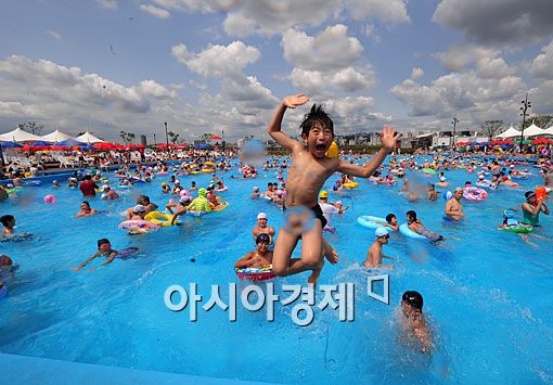 서울 낮기온이 30도 가까이 올라가는등 무더운 날씨를 보인 26일 새롭게 단장한 여의도 한강 시민공원 수영장을 찾은 한 어린아이가 코믹한 표정으로 다이빙을 즐기고 있다.