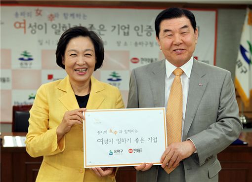 한미약품이 서울 송파구청(구청장 김영순, 사진 왼쪽) 선정 '여성이 일하기 좋은 기업'에 선정됐다.